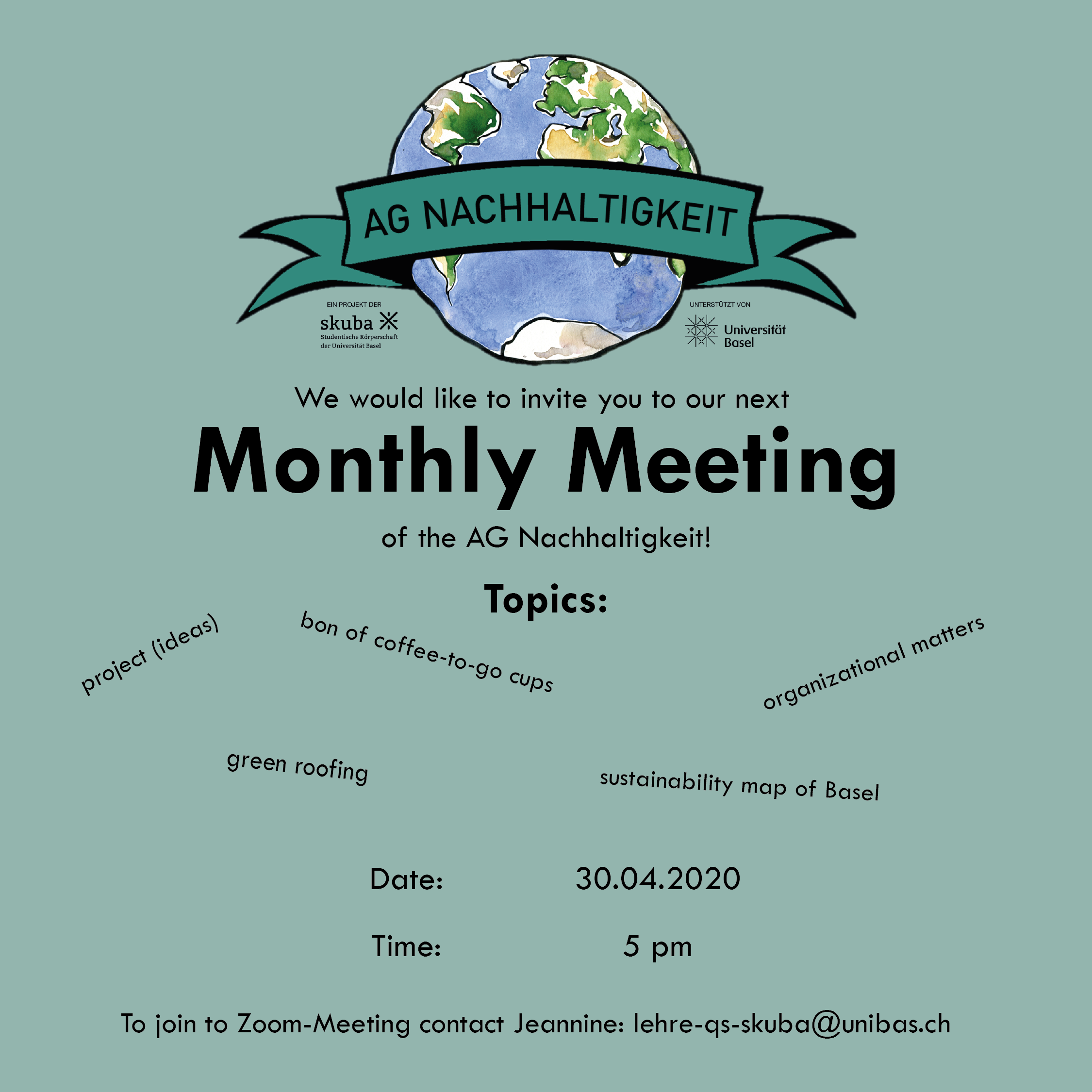 We would like to invite you to our next monthly meeting of the AG Nachhaltigkeit!