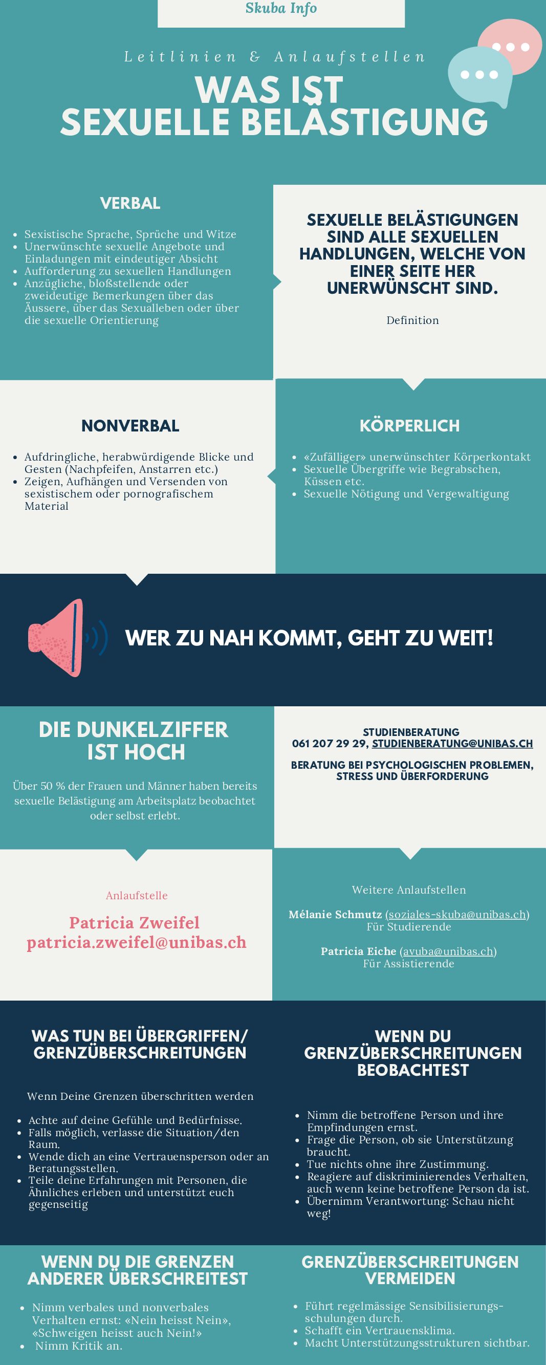 Du darfst Dich jederzeit bei der Koordinationsstelle der Universität Basel für Persönliche Integrität melden. Die Koordinationsstelle bietet eine persönliche Begleitung bei Verletzungen der persönlichen Integrität an.